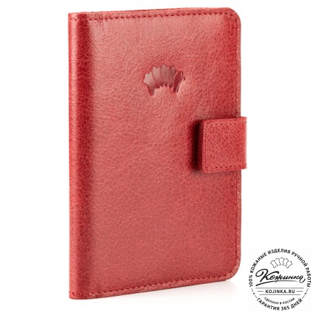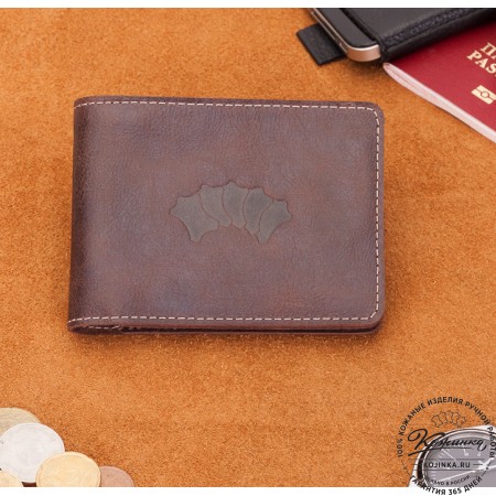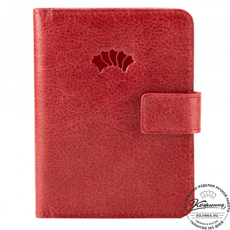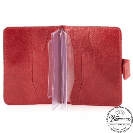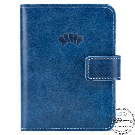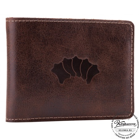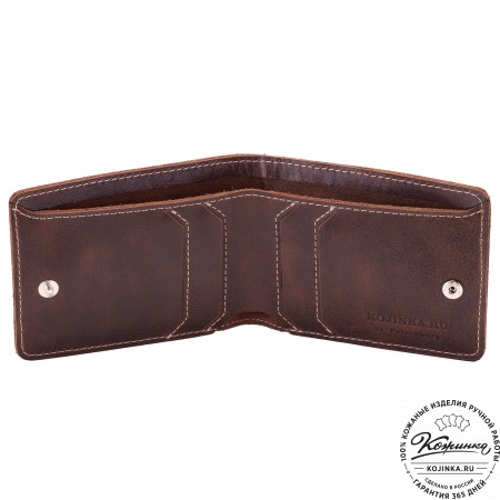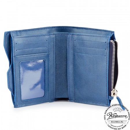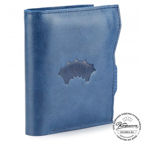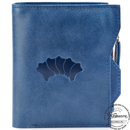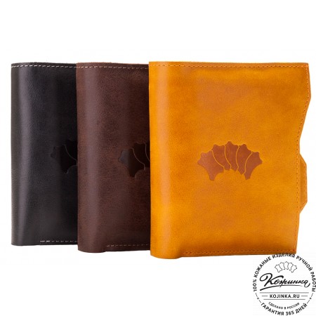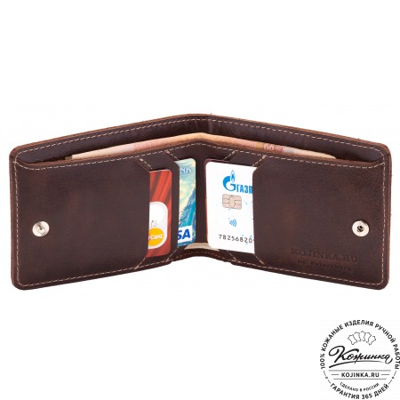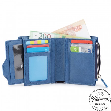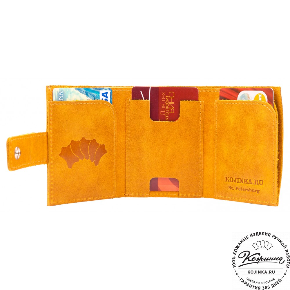 Этот купюрник в три сложения закрывается на хлястик с кнопкой. Внутри распологаются: откидное отделение для купюр и три кармана для карт.