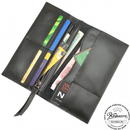 Внутри расположено отделение для купюр с перегородкой, на перегородке имеются карманы для карт, потайные карманы и пластиковый карман, отделанный кожей.