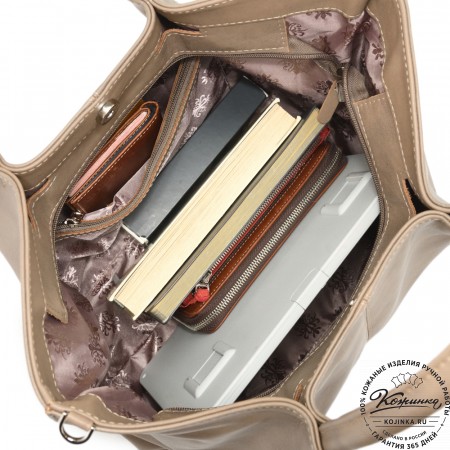 Кроме ручки у сумки есть съемный плечевой ремень, который регулируется по длине. Ремень крепится на металлические карабины и имеет небольшой кожаный наплечник для большего удобства.