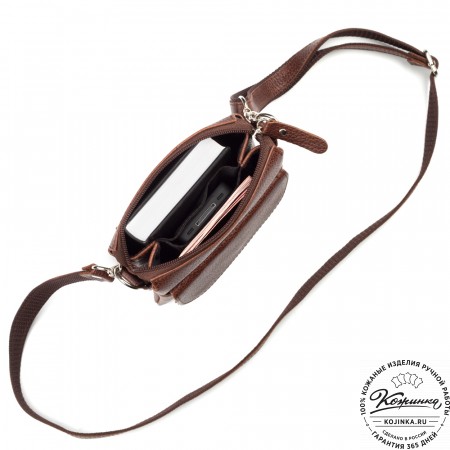 Снаружи, на передней стенке, объемный карман на магнитной кнопке. Еще один карман для телефона на магнитной кнопке, расположенный на лямке.