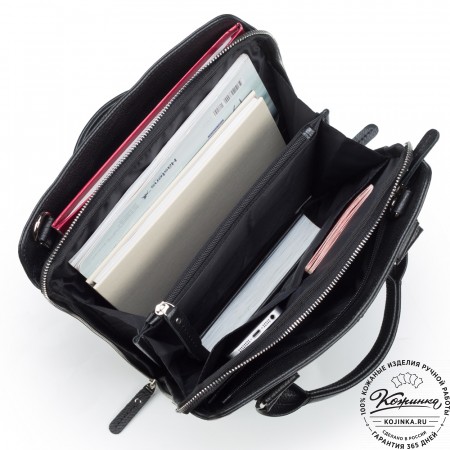 Внутри основного отделения, на задней стенке, мини-органайзер с карманом на молнии для документов, открытым карманом для телефона, отсеками для ручек и визиток.