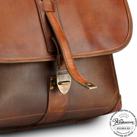 У портфеля прочная удобная ручка и кожаный плечевой ремень в комплекте. Ремень съемный, крепится по бокам на небольшие карабины, регулируется по длине ременной пряжкой. Свободный конец ремня аккуратно фиксируется кожаным кольцом.