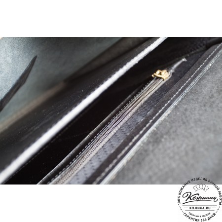 Портфель из 100% натуральной толстой кожи, закрывается на одну пряжку с регулируемой длиной. Сверху конструкция укреплена жёсткой толстой кожей. Внутри два удобных отдела разделённых перегородкой с карманом на молнии. В переднем отделении есть дополнительный малый карман на молнии. На задней стенке имеется один накладной кожаный карман и второй карман на молнии - для быстрого доступа.