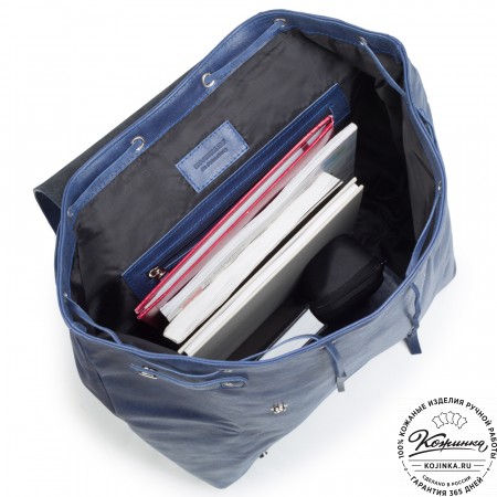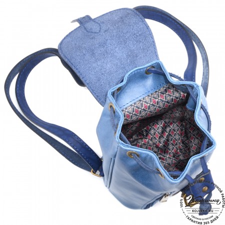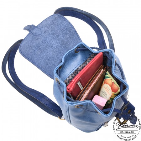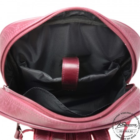 Рюкзак имеет одно отделение, которое закрывается кожаным шнуром-стяжкой и сверху клапаном с портфельной пряжкой.