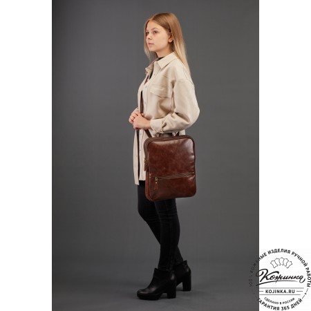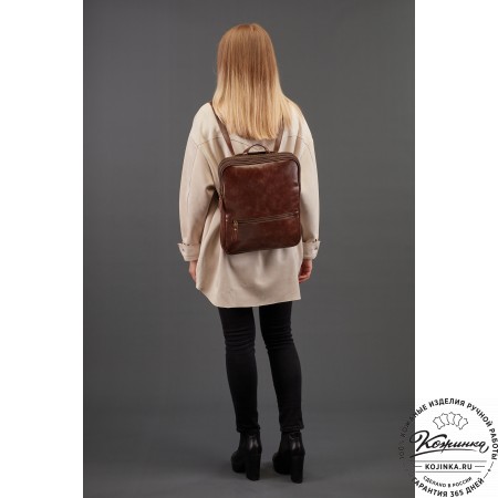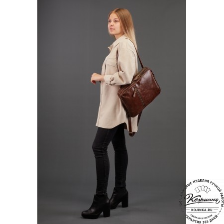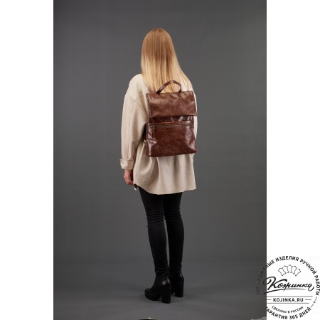 На моделях представлены рюкзак "Бэнжамин" коричневого цвета и рюкзак из кожи Крейзи хорс коричневого цвета.