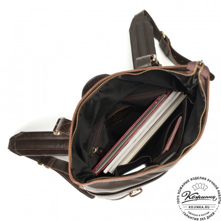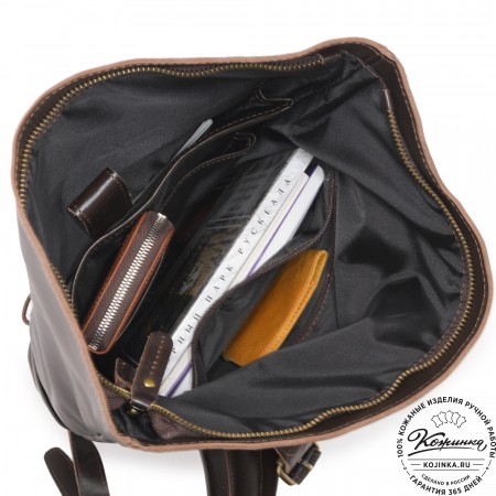 Лямки рюкзака из кожи, усилены стропой, регулируются по длине. Лямки можно соединить вмести молнией и удобно носить рюкзак на одно плечо.