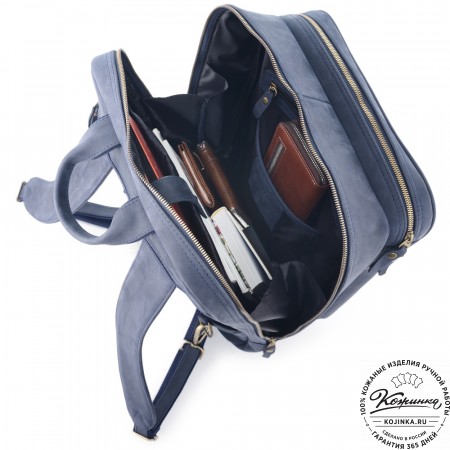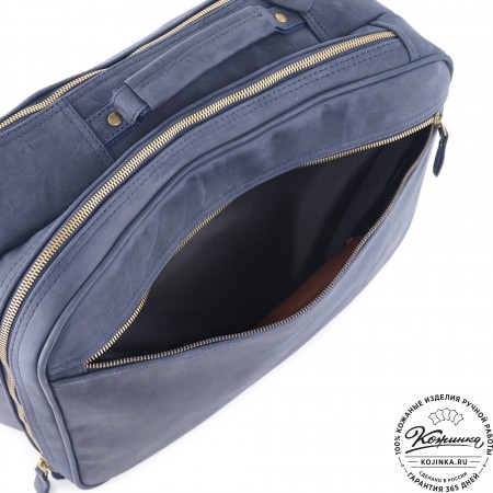 У сумки два автономных отделения. Одно отделение предназначено для ноутбука – в нем расположена специальная секция с мягкой стенкой. Кожаный хлястик на липучке надежно фиксирует ноутбук в секции. Кроме ноутбука, в этом отделении прекрасно поместится папка с документами формата А4. Закрывается отделение на длинную молнию и имеет широкий угол открытия, поэтому доставать и складывать вещи очень удобно.